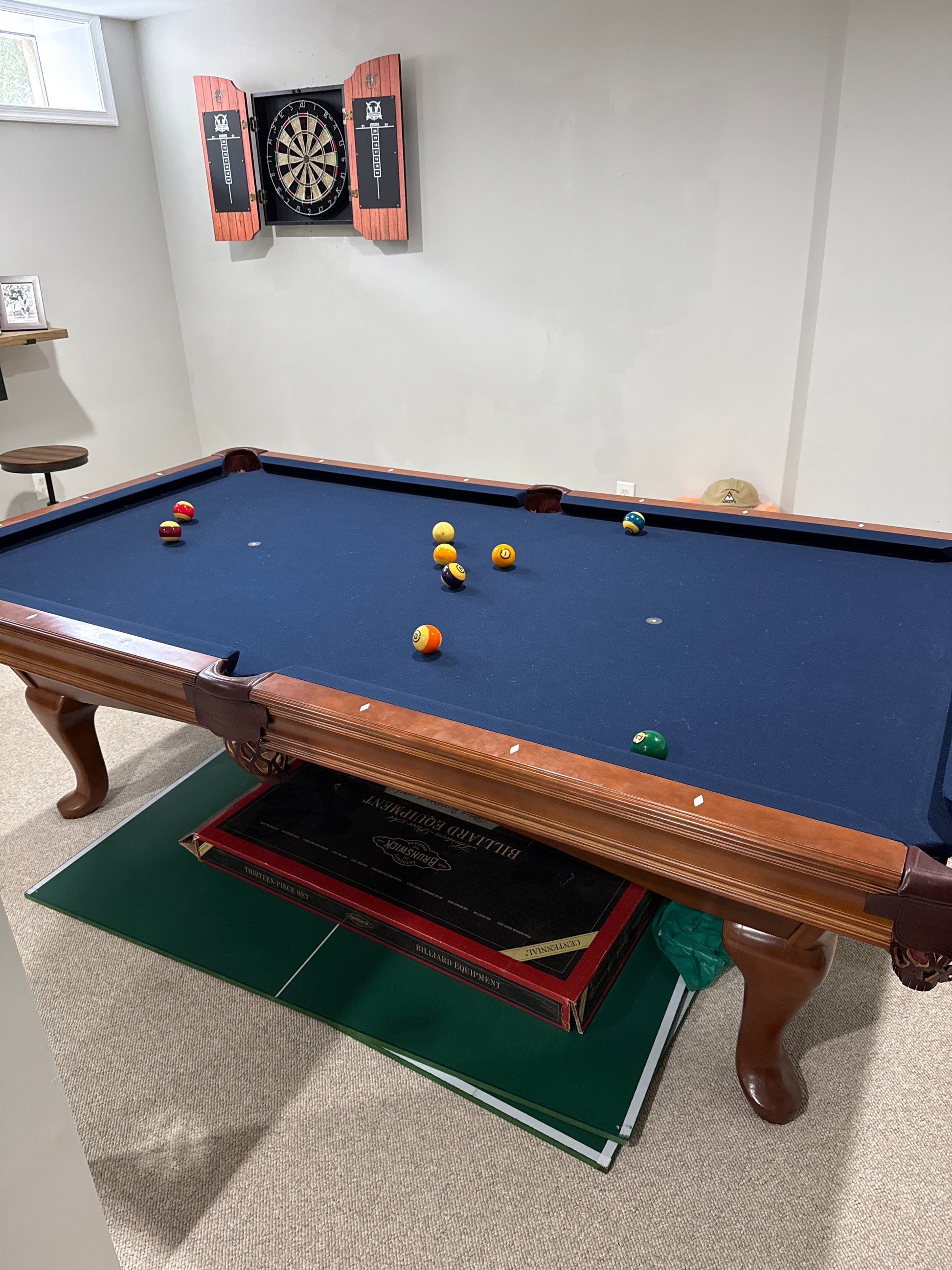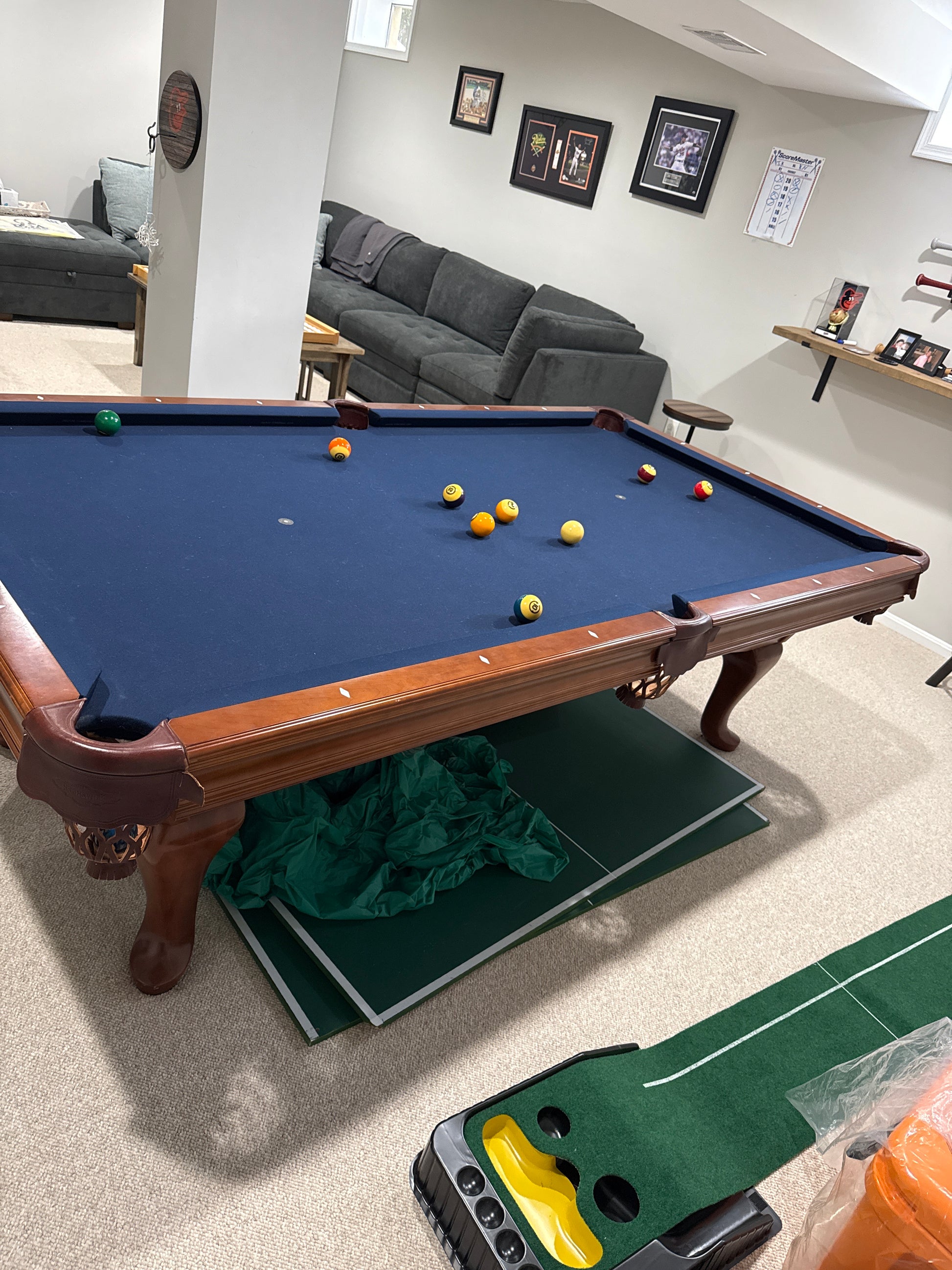 - Cost of the table includes the table and any noted accessories, all move costs to move, setup and level the table within 20 miles of North Potomac, MD and optional re-felting of the table upon arrival using Championship Invitational felt with Teflon coating in the color of the buyer's choosing or save $150 off the listed price by reusing the existing felt.