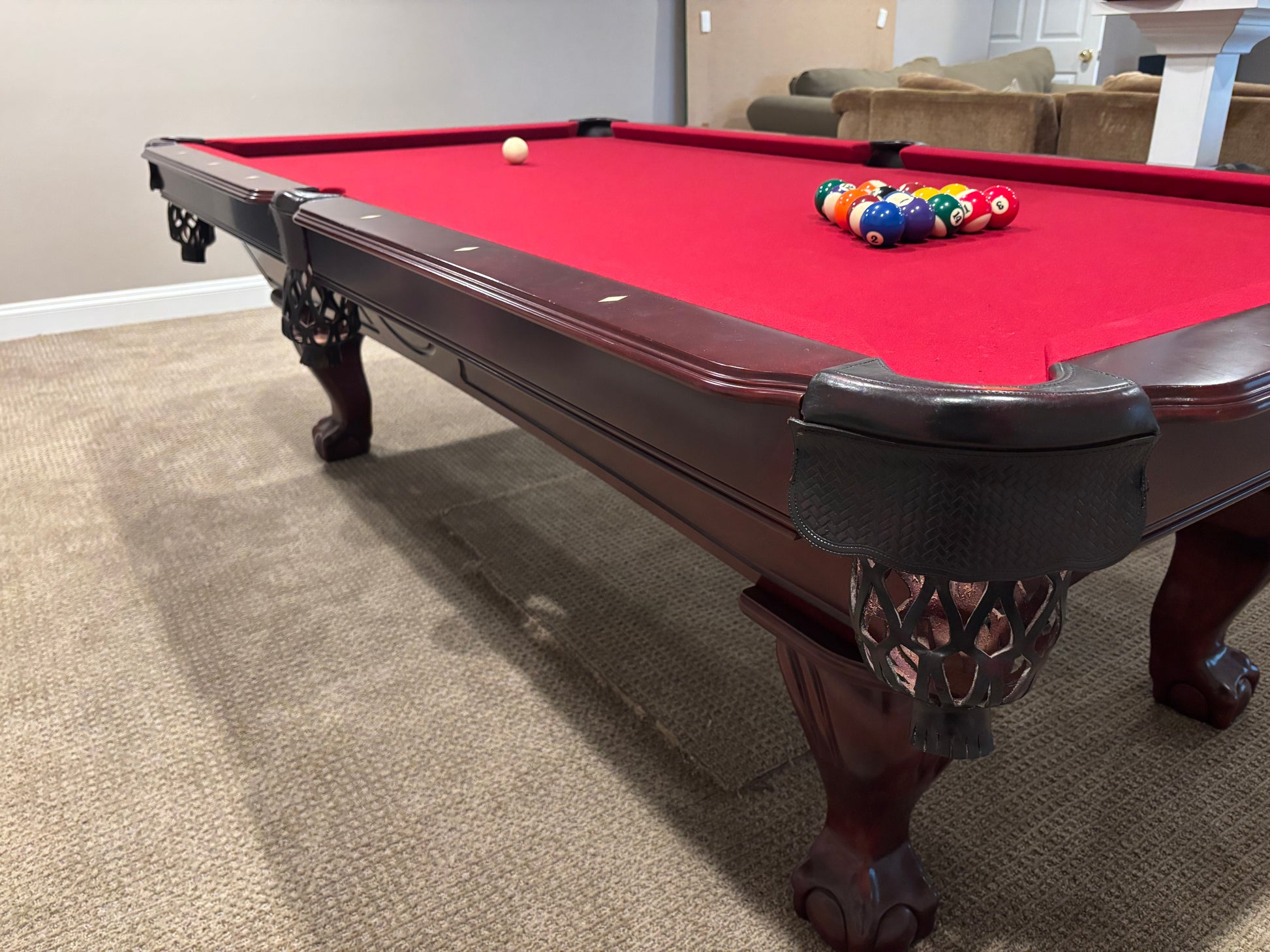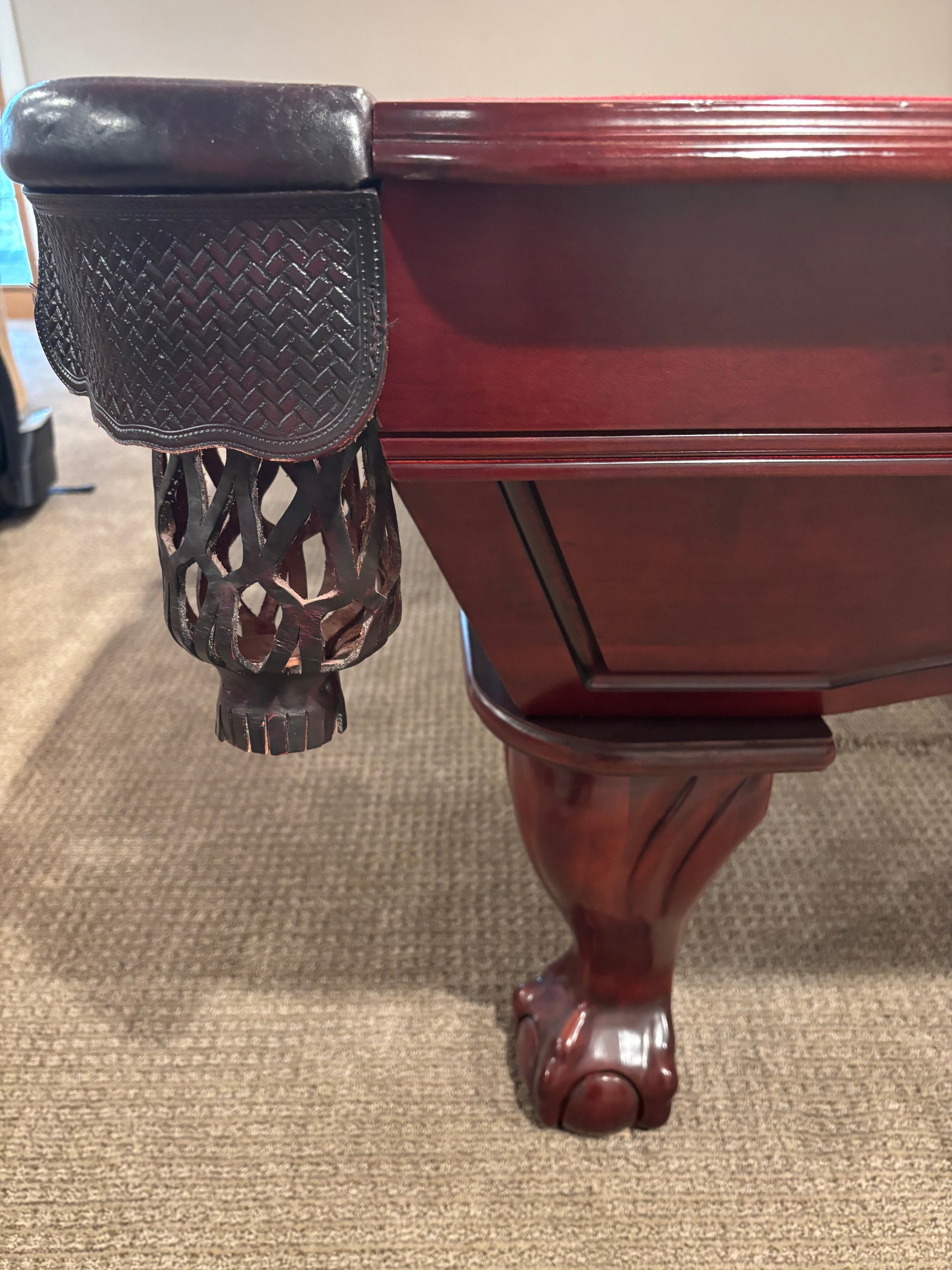 - Sellers Note: "Walnut Finish, 3-piece diamond honed wood-backed slate, leather drop pockets with solid shields, ball and claw legs, and mother of pearl inlays."