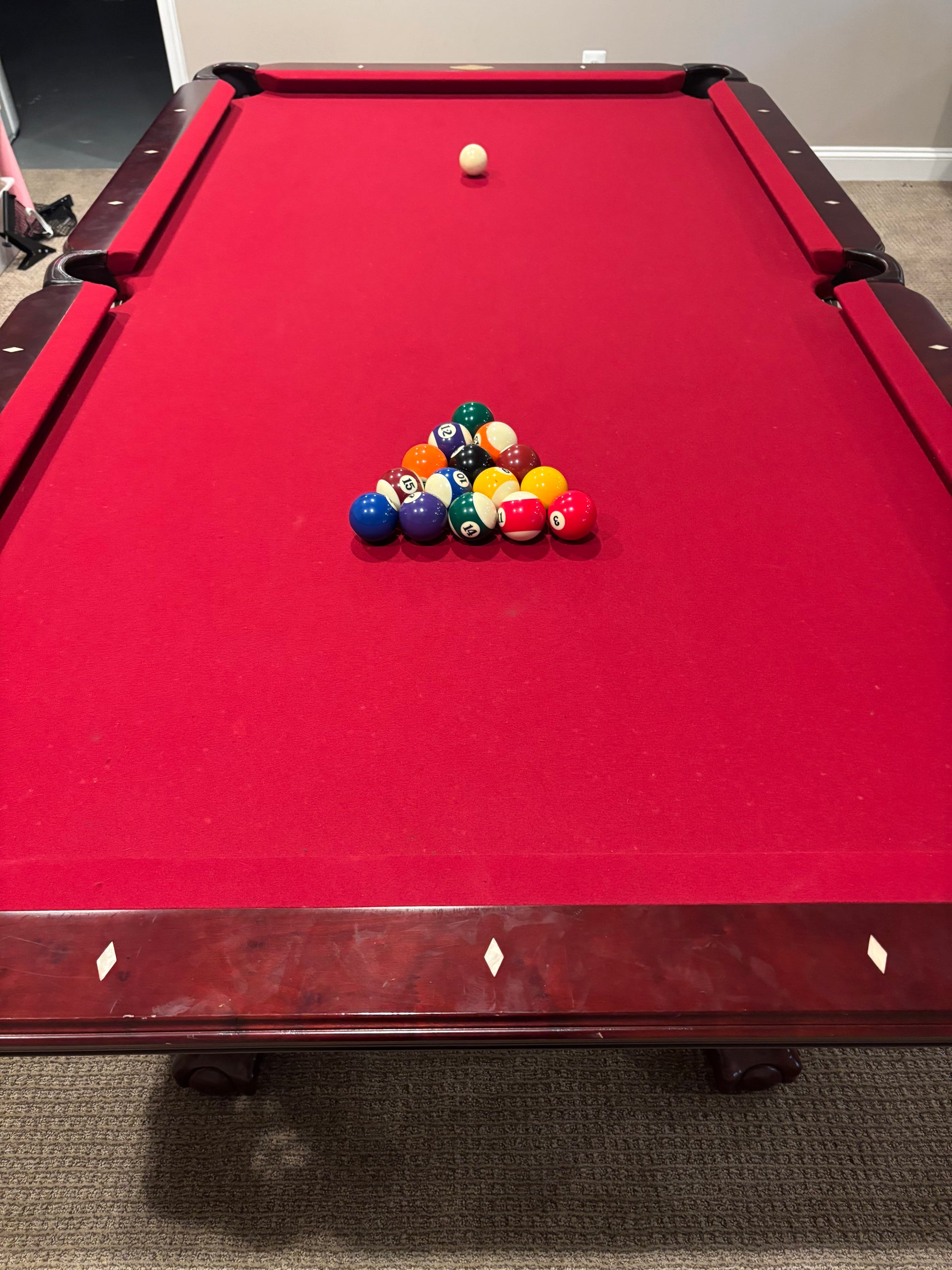 15 and 9 ball triangles - Cost of the table includes the table and any noted accessories, all move costs to move, setup and level the table within 20 miles of Crownsville, MD and optional re-felting of the table upon arrival using Championship Invitational felt with Teflon coating in the color of the buyer's choosing or save $150 off the listed price by reusing the existing felt.